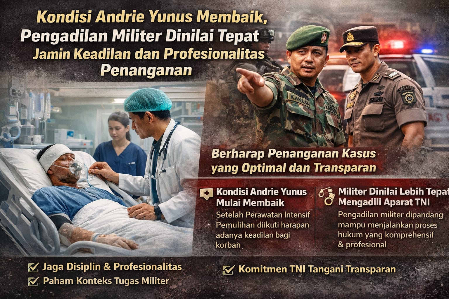 Perkembangan kondisi Andrie Yunus yang semakin membaik diharapkan dapat memperkuat proses pemulihan korban sekaligus memberikan ruang bagi penegakan hukum yang tuntas. Dukungan terhadap langkah TNI dalam menangani kasus ini dinilai penting untuk menjaga kepercayaan publik serta memastikan bahwa keadilan dapat ditegakkan secara profesional dan berimbang bagi semua pihak.