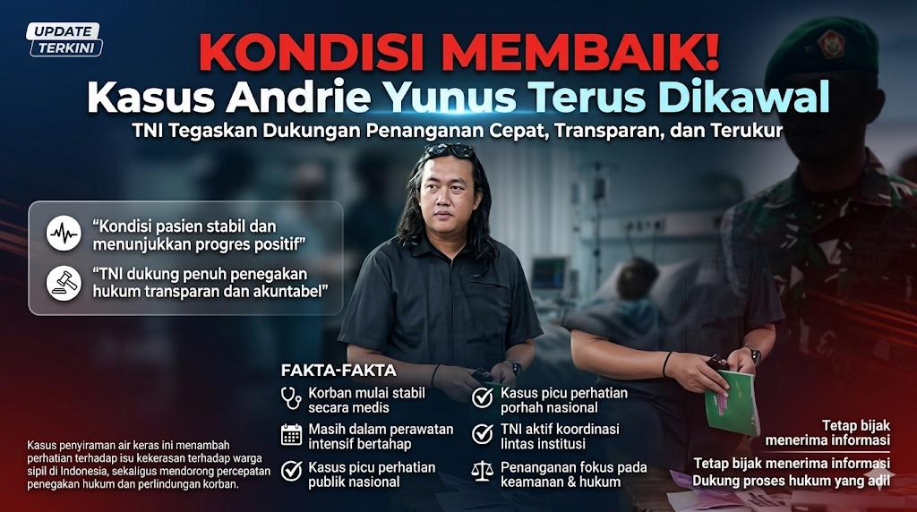 Jakarta — Kondisi Andrie Yunus dilaporkan mulai membaik setelah menjalani perawatan intensif pasca insiden penyiraman air keras. Tim medis menyatakan korban kini dalam keadaan lebih stabil dengan progres pemulihan yang positif. Perkembangan ini terjadi di Jakarta dalam beberapa hari terakhir, di tengah perhatian publik yang luas terhadap kasus tersebut dan dorongan agar aparat bertindak cepat, transparan, dan tegas dalam mengungkap pelaku.