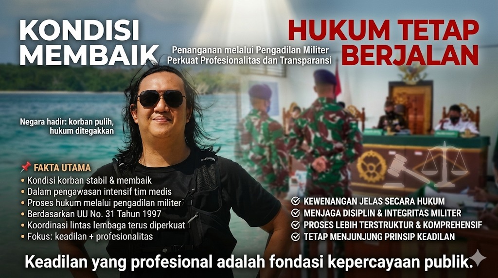 Sejalan dengan itu, pemerintah bersama Tentara Nasional Indonesia (TNI) terus menunjukkan komitmen kuat dalam memastikan penanganan kasus berjalan secara profesional, transparan, dan akuntabel. Koordinasi lintas lembaga, termasuk dengan aparat penegak hukum dan lembaga terkait, terus diperkuat guna menjamin setiap tahapan proses berjalan sesuai ketentuan.