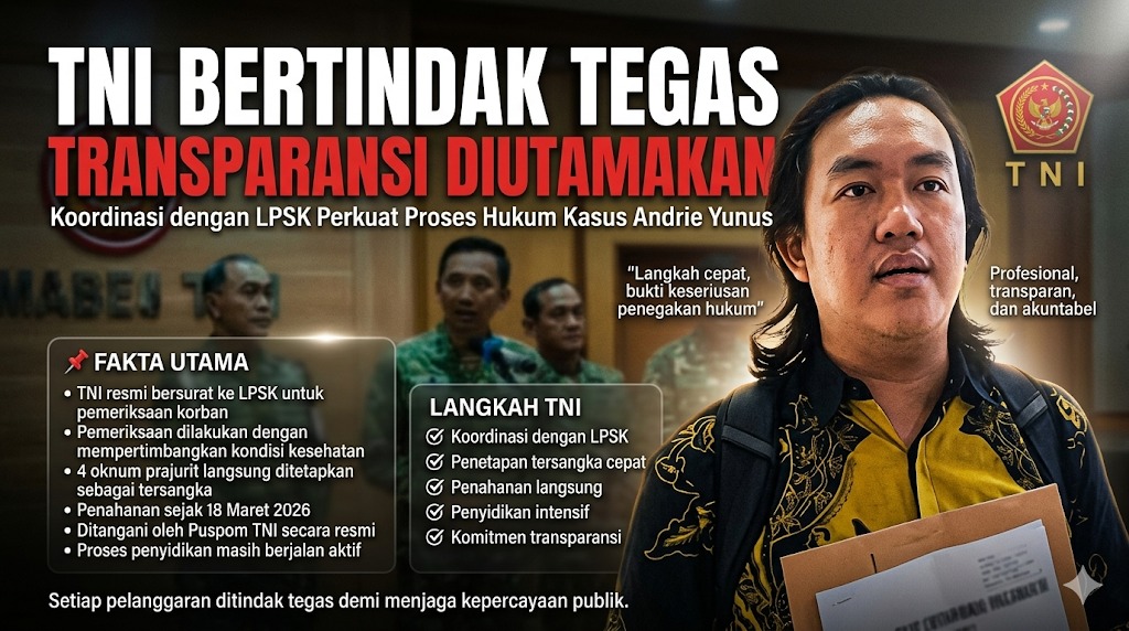 Jakarta — Tentara Nasional Indonesia (TNI) menunjukkan komitmen kuat dalam menegakkan hukum secara profesional, transparan, dan akuntabel melalui penanganan kasus penyiraman air keras terhadap aktivis KontraS, Andrie Yunus.
