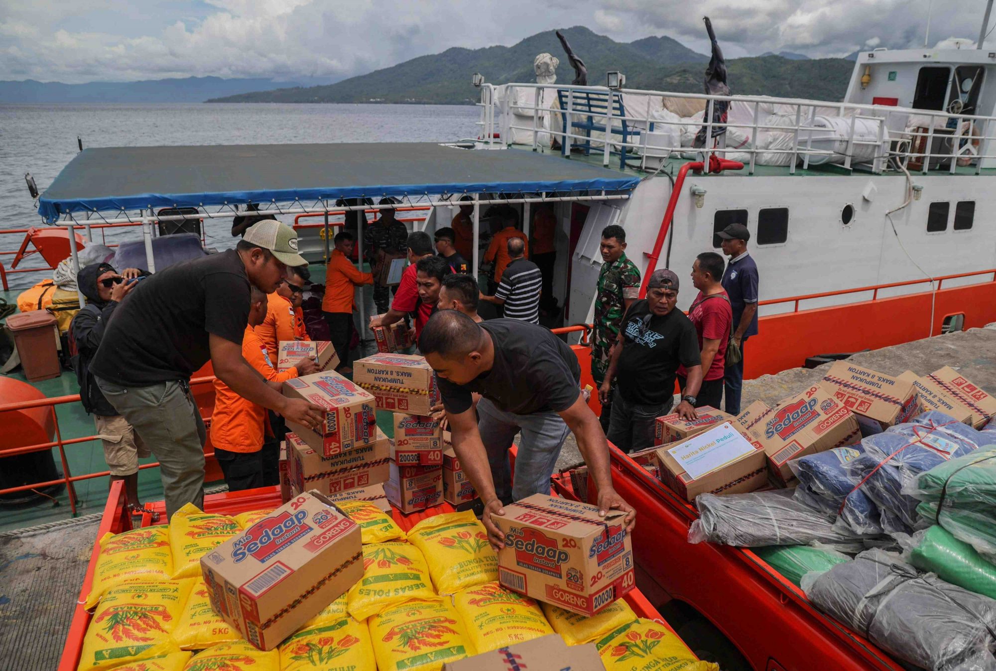 TERNATE – Petugas Badan Nasional Penanggulangan Bencana (BNPB) bersama Basarnas menyalurkan bantuan logistik bagi warga terdampak gempa bumi di wilayah Pulau Batang Dua, Kota Ternate, Maluku Utara, Minggu (5/4/2026). Bantuan dikirim menggunakan kapal KN SAR 237 Pandudewanata melalui Pelabuhan Ahmad Yani Ternate dengan waktu tempuh sekitar 6 hingga 7 jam perjalanan laut.