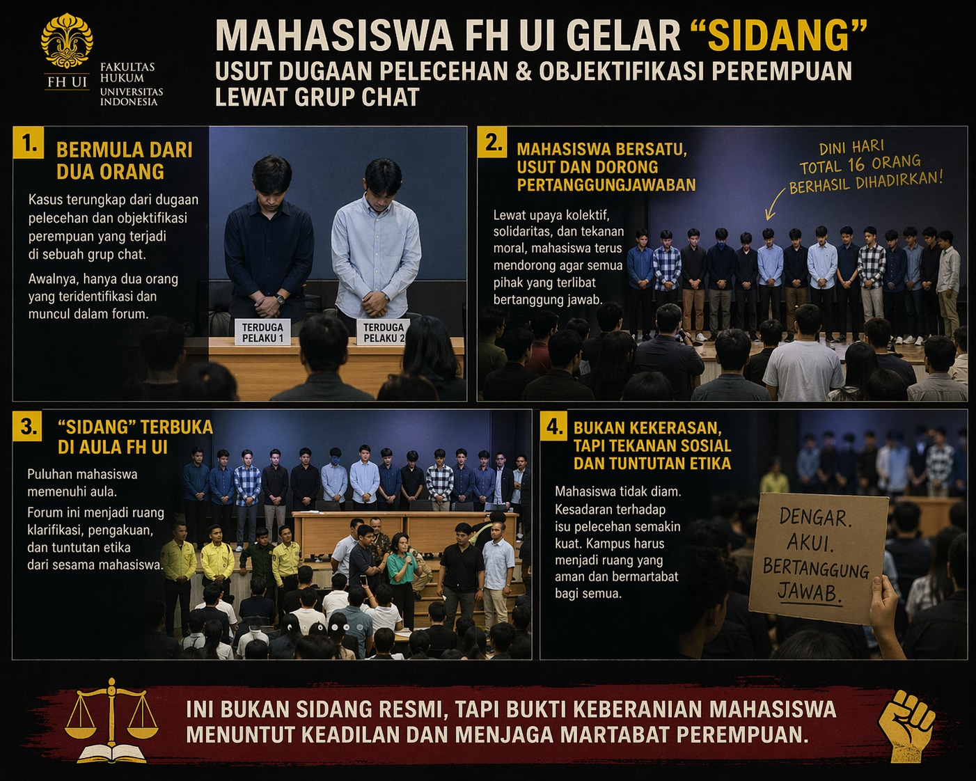 Sebanyak 16 mahasiswa berhasil dihadirkan dalam forum terbuka hingga dini hari untuk mempertanggungjawabkan perbuatan mereka: pelecehan verbal dan objektifikasi perempuan yang dilakukan secara sistematis melalui sebuah grup percakapan (group chat).