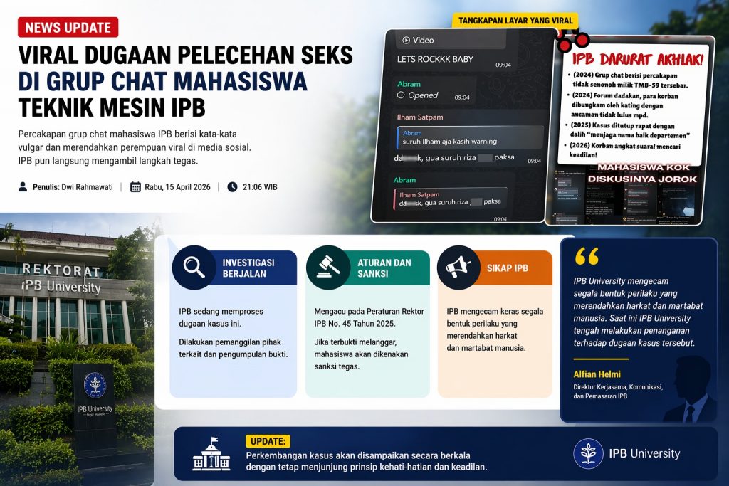 DetikNews – “Viral Dugaan Pelecehan Seks di Grup Chat Mahasiswa Teknik Mesin, IPB Investigasi” (15 April 2026)