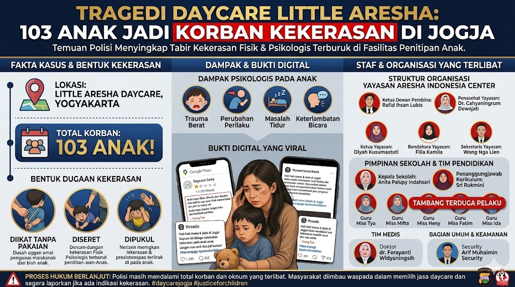 YOGYAKARTA, 27 April 2026 — Kepolisian Daerah Istimewa Yogyakarta (Polda DIY) terus mengusut kasus dugaan kekerasan terhadap anak di daycare Little Aresha, Umbulharjo, Yogyakarta. Hingga Minggu (26/4/2026), polisi telah menetapkan 13 tersangka yang terdiri dari ketua yayasan, kepala sekolah, serta para pengasuh yang terlibat langsung dalam aktivitas di lokasi. Penetapan dilakukan setelah penggerebekan pada Jumat (24/4/2026) yang menemukan indikasi perlakuan tidak manusiawi terhadap anak-anak.